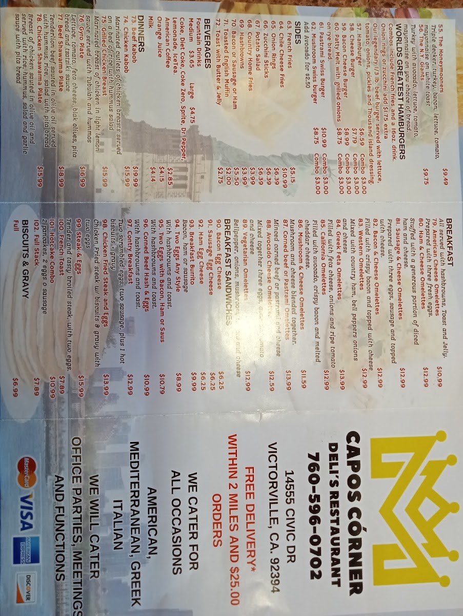 Capos Corner Grill and NY Deli in Victorville is a true family dining treasure, offering a diverse and flavorful menu that satisfies every palate. From hearty sandwiches like the Greek Gyro, Beef Shawarma, and Pastrami Swiss Burger to fresh, vibrant salads such as the Chef Salad and Greek Gyro Salad, every dish is crafted with fresh, made-to-order ingredients. The menu extends beyond sandwiches to include satisfying dinners and breakfast favorites like Bacon & Cheese Omelettes and French Toast, making it perfect for any mealtime.